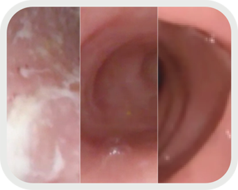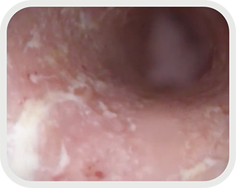 Real clinical trial endoscopy images from a patient who received SKYRIZI 1200 mg during induction and 180 mg during maintenance. Patient achieved visible colon lining repair at 12 weeks and 1 year.†